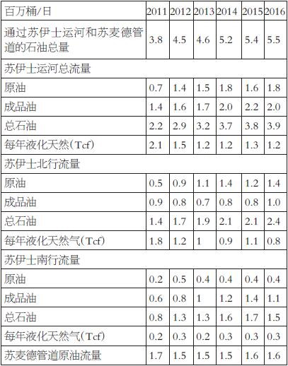 表為2011—2016年蘇伊士運(yùn)河和蘇麥德管道石油和液化天然氣流量表為2011—2016年蘇伊士運(yùn)河和蘇麥德管道石油和液化天然氣流量
