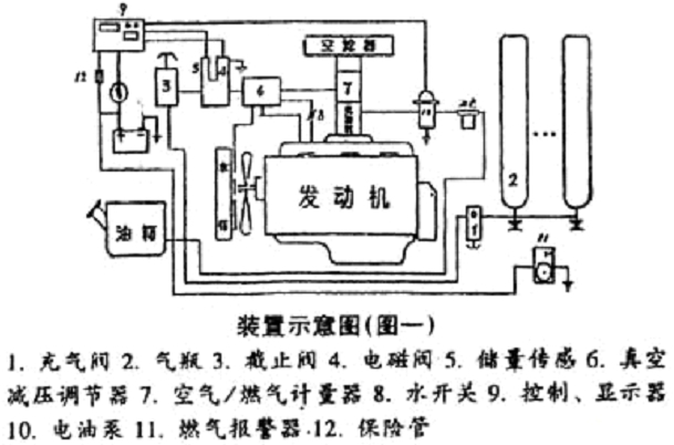 3、天然氣燃料轉(zhuǎn)換控制系統(tǒng):由油氣轉(zhuǎn)換開關(guān)、燃?xì)饪刂艵CU(仿真器)、電動油泵(或汽油電磁閥)、點火時間提前器、壓力傳感器及顯示器等組成。