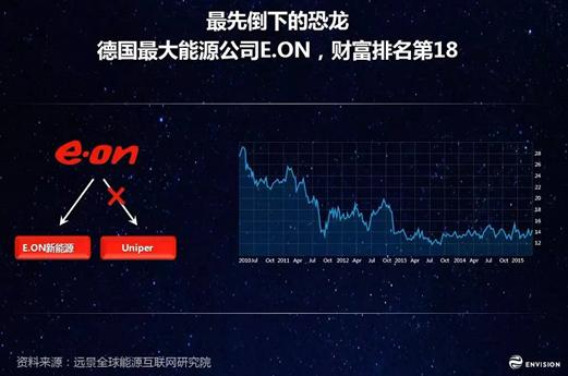 這些恐龍怎么樣了?在環(huán)境已經(jīng)發(fā)生變化的德國,他最大能源公司E.ON是最先倒下的恐龍。E.ON在2014年年底就宣稱碰到了前所未有的挑戰(zhàn),面對兩個能源世界,一個是傳統(tǒng)的能源世界;另外一個是嶄新的能源世界。在傳統(tǒng)的能源世界,他們非常沮喪,新投的幾億美元的天然氣電站,可能在一年時間也就只有十幾天可以帶負荷發(fā)電。在這么一個氣候已經(jīng)變化的環(huán)境中,市場機制已經(jīng)在篩選出一些物種。