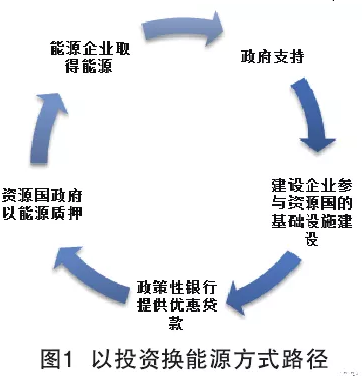 以投資換能源方式遵循“政府支持—建設(shè)企業(yè)參與資源國(guó)的基礎(chǔ)設(shè)施建設(shè)—政策性銀行提供優(yōu)惠貸款—資源國(guó)政府以能源質(zhì)押—能源企業(yè)取得能源”的路徑。以投資換能源方式依托機(jī)制化運(yùn)作,形成兩國(guó)政府、政策性銀行、參與企業(yè)互動(dòng)的循環(huán)過程。具體如圖1所示。
