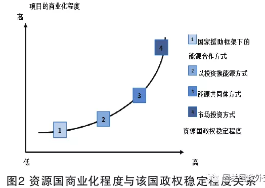通過總結(jié)21世紀(jì)初中非四種常規(guī)能源外交方式,可以認(rèn)為21世紀(jì)中非能源合作方式中,能源項(xiàng)目的商業(yè)化程度與非洲資源國(guó)政權(quán)的掌控力相關(guān)。資源國(guó)政權(quán)掌控力越強(qiáng),社會(huì)成熟化程度越高,該國(guó)的能源項(xiàng)目商業(yè)化程度越高。資源國(guó)政府只有政權(quán)穩(wěn)定,才有足夠的實(shí)力保障國(guó)家的社會(huì)穩(wěn)定、維護(hù)政權(quán)的合法統(tǒng)治,才能進(jìn)行國(guó)民經(jīng)濟(jì)建設(shè),制定合理的政策法規(guī)吸引外資,建設(shè)本國(guó)能源工業(yè)體系。通過上文對(duì)21世紀(jì)中非能源合作方式的總結(jié),可歸納出以下規(guī)律:通常采用國(guó)家援助框架下的能源合作方式的非洲資源國(guó)政權(quán)穩(wěn)定程度最低,能源項(xiàng)目的商業(yè)化程度最弱,例如蘇丹;采用以投資換能源方式的非洲資源國(guó)穩(wěn)定程度仍然較低,能源項(xiàng)目的商業(yè)化程度較弱,例如安哥拉;采用能源共同體方式的非洲資源國(guó)穩(wěn)定程度較高,項(xiàng)目商業(yè)化程度較高;采用市場(chǎng)投資方式的非洲資源國(guó)最為穩(wěn)定,能源項(xiàng)目的商業(yè)化程度最高。具體關(guān)系如圖2所示。