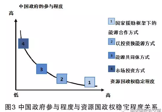 資源國(guó)政權(quán)的穩(wěn)定程度與中國(guó)政府參與方式及程度反向相關(guān)。在國(guó)家援助框架下的能源合作中,中國(guó)政府的參與程度最高,資源國(guó)政權(quán)掌控力越弱;以投資換能源方式中,中國(guó)政府參與程度較高,資源國(guó)政府穩(wěn)定程度較弱;能源共同體方式中,中國(guó)政府參與程度較低,資源國(guó)政府穩(wěn)定程度較強(qiáng);市場(chǎng)投資方式中,中國(guó)政府參與程度最低,資源國(guó)政府穩(wěn)定程度最強(qiáng)。具體關(guān)系如圖3所示。