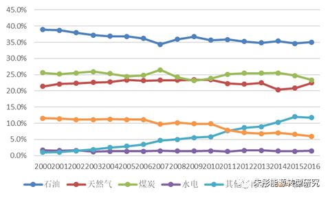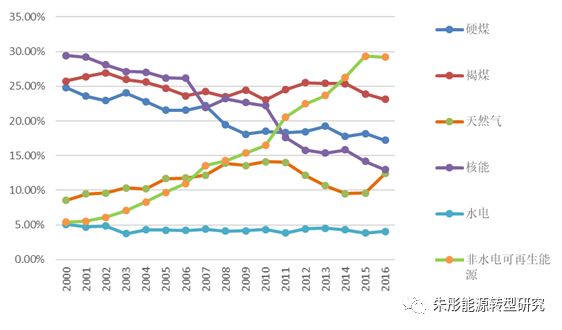 2000年以來,天然氣和核能在美國向“清潔能源”中起到了非常重要的作用。2000-2016年年間,天然氣份額從26%增加到31.5%,核能份額從7.8%增加到8.4%,非水可再生能源從0.76%增加到3.7。同期煤炭消費份額大幅下降,從24.6%下降到15.8%,而石油消費份額大致保持不變。