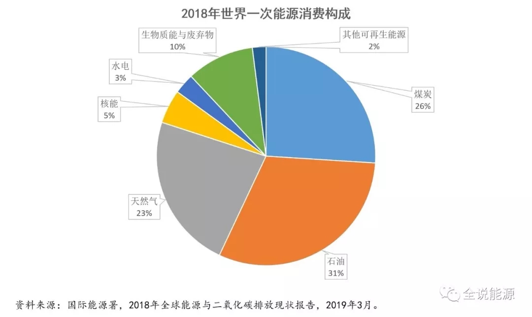 2018年世界一次能源消費(fèi)中,石油位列第一,占比31%;位列第二的是煤炭,占比26%;位列第三的是天然氣,占比23%。三種傳統(tǒng)化石能源合計(jì),占2018年世界一次能源消費(fèi)總量的80%,這就是說當(dāng)今世界的能源消費(fèi)仍處于傳統(tǒng)的化石能源時(shí)代。