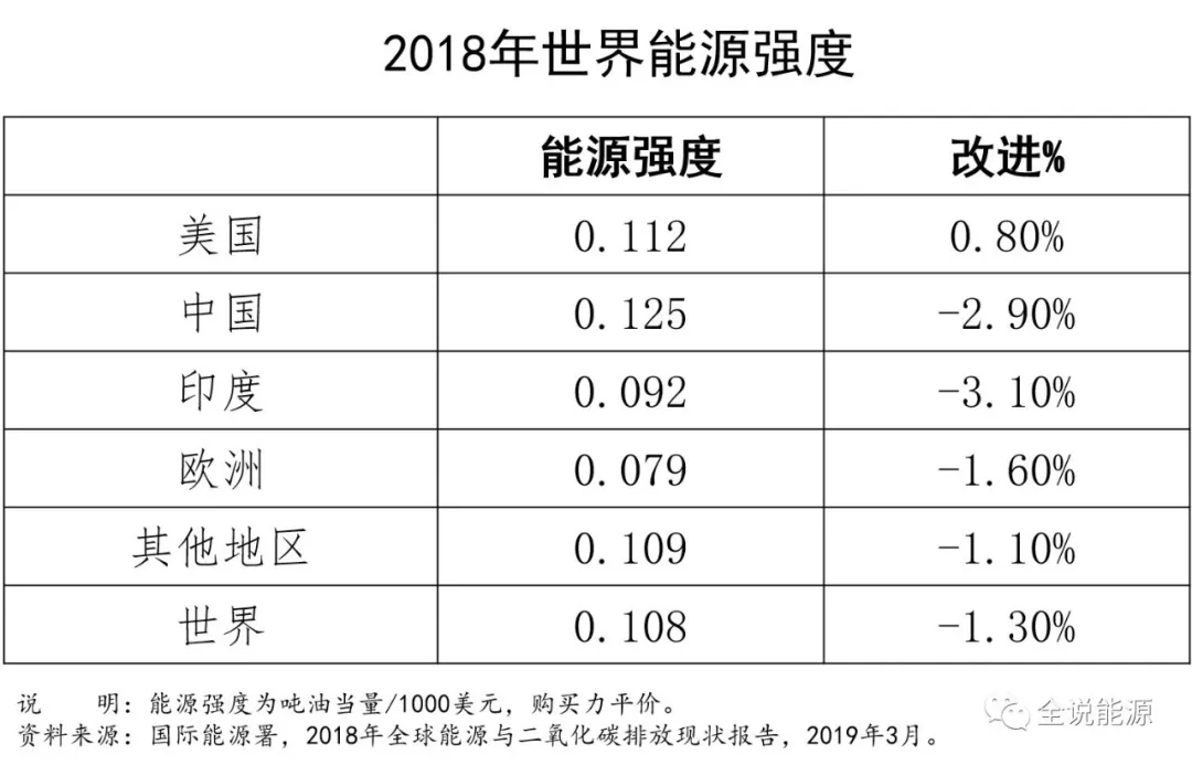 近年來實(shí)施的穩(wěn)健政策提高了效率,限制了排放增長(zhǎng),2018年中國(guó)一次能源強(qiáng)度提高了2.9%,盡管這一能源效率提高的速度是全球平均水平的兩倍多,但這是自2011年以來中國(guó)能源效率增長(zhǎng)最慢的一年,能源效率的提高不足以抵消燃煤發(fā)電量增加對(duì)能源需求的影響。