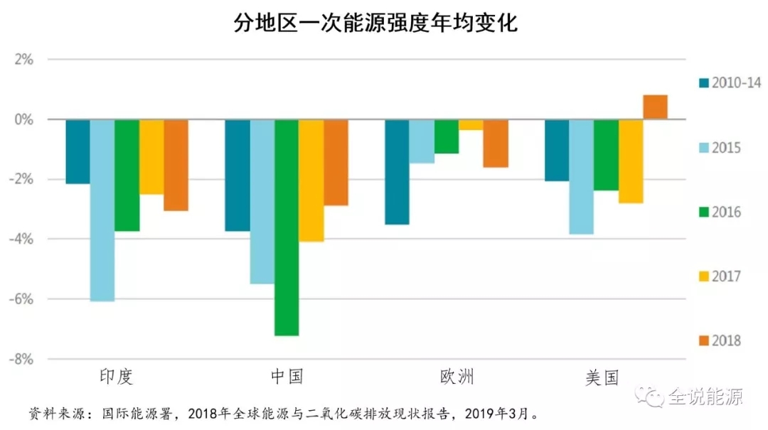 全球能源效率的改變有顯著的區(qū)域差異。與2017年相比,歐洲和印度2018年能源效率的改善均有所提高,但世界其他地區(qū)的放緩決定了2018年全球能效平均水平的降低。