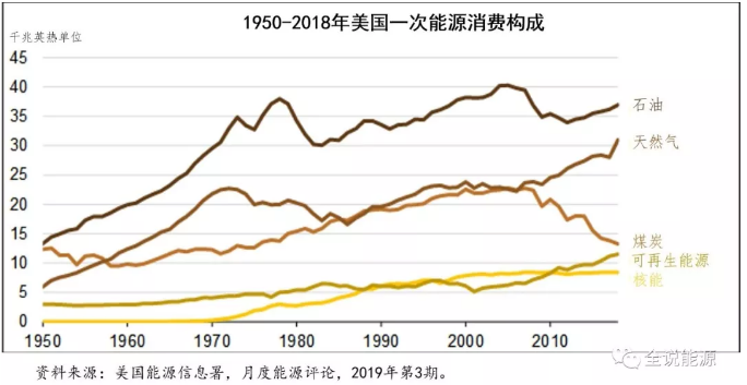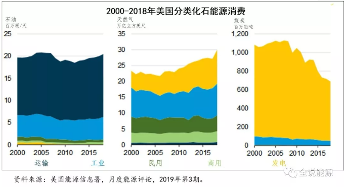石油、天然氣和煤炭三大化石能源,是美國(guó)能源消費(fèi)的主體,占2018年美國(guó)一次能源消費(fèi)總量的80%,合計(jì)增長(zhǎng)了4%。與2017年相比,2018年美國(guó)天然氣消費(fèi)增長(zhǎng)了10%,也創(chuàng)了歷史紀(jì)錄。2018年,美國(guó)煤炭消費(fèi)下降了4%,但由于天然氣消費(fèi)的高速增長(zhǎng),加之石油、可再生能源和核能的小幅增長(zhǎng),彌補(bǔ)了煤炭消費(fèi)的下降。
