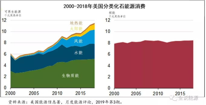 2018年,美國(guó)水電消費(fèi)減少了3%,風(fēng)能、太陽(yáng)能和生物質(zhì)能消費(fèi)的增加彌補(bǔ)了這一部分的減少。