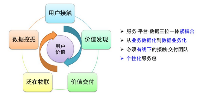 3.價(jià)值交付:通過線下的服務(wù)渠道,把個(gè)性化的服務(wù)解決方案交付用戶;