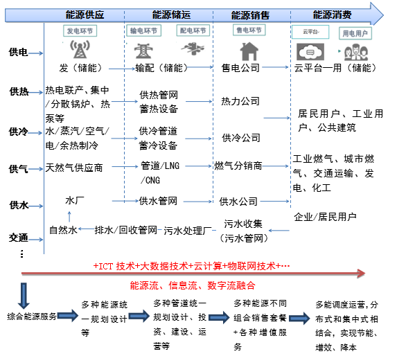 然而,目前各類能源子系統(tǒng)之間在規(guī)劃、設(shè)計(jì)、建設(shè)、運(yùn)行和管理層面仍相互獨(dú)立,存在體制壁壘。企業(yè)在開展供電、供熱、供冷、供水、供氣等多種業(yè)務(wù)時(shí),都有各自獨(dú)立的產(chǎn)業(yè)鏈。
