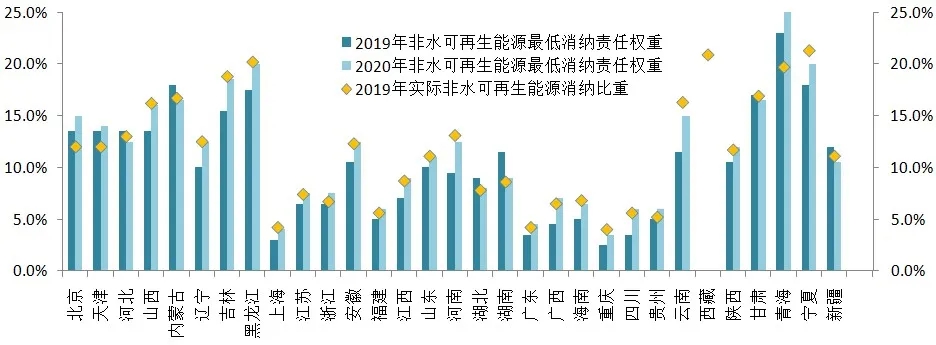 這樣的原則充分考慮了各地區(qū)可再生能源發(fā)展的基礎(chǔ)和條件、與既往及“十三五”期間其他可再生能源政策的銜接,以及消納保障機(jī)制實(shí)施初期的落實(shí)和操作性問題,因此2020年各省份之間責(zé)任權(quán)重指標(biāo)各不相同,差異較大(如圖1所示)。