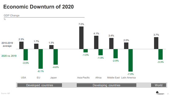 受大流行病的影響,全球經(jīng)濟(jì)在2020年出現(xiàn)了創(chuàng)紀(jì)錄的崩潰——在經(jīng)歷了每年近4%的十年增長后,全球GDP下降了3.3%,即3萬億美元,這相當(dāng)于法國和英國的GDP。
