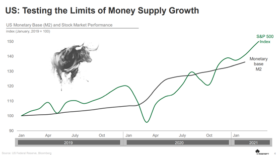 以美國的貨幣增長為例。美國政府采取的行動導(dǎo)致了2020年25%的貨幣增長,這種增長將在未來一年繼續(xù)下去。這些支持經(jīng)濟(jì)的計劃,以及美聯(lián)邦儲備系統(tǒng)的量化寬松政策,對實體經(jīng)濟(jì)復(fù)蘇的貢獻(xiàn)有限。