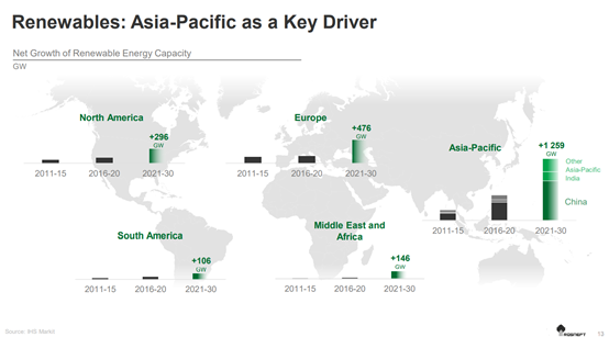 亞太地區(qū)成為可再生能源發(fā)展的火車頭,因為在過去的10年里,其可再生能源能力的增長比歐洲和美國高幾倍。據(jù)分析,這一趨勢將在未來10年內(nèi)持續(xù)下去。因此,中國、印度和其他亞太國家的可再生能源產(chǎn)能投產(chǎn)范圍將超過歐洲的2.5倍以上。這將是一個平衡的增長,將與常規(guī)能源的發(fā)展同時進(jìn)行。