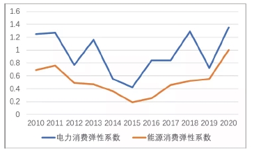 圖3 2010-2020年能源消費(fèi)彈性系數(shù)和電力消費(fèi)彈性系數(shù)