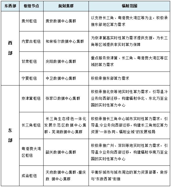 按照全國一體化大數(shù)據(jù)中心體系布局,8個(gè)國家算力樞紐節(jié)點(diǎn)將作為我國算力網(wǎng)絡(luò)的骨干連接點(diǎn),發(fā)展數(shù)據(jù)中心集群,開展數(shù)據(jù)中心與網(wǎng)絡(luò)、云計(jì)算、大數(shù)據(jù)之間的協(xié)同建設(shè),并作為國家“東數(shù)西算”工程的戰(zhàn)略支點(diǎn),推動(dòng)算力資源有序向西轉(zhuǎn)移,促進(jìn)解決東西部算力供需失衡問題。