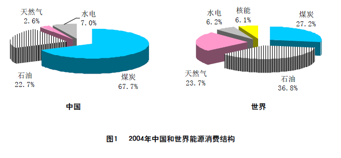 我國(guó)能源消耗量大,而且結(jié)構(gòu)不合理,不但影響經(jīng)濟(jì)持續(xù)平穩(wěn)發(fā)展,而且?guī)硪幌盗袊?yán)重的結(jié)構(gòu)性環(huán)境污染問題。目前我國(guó)能源結(jié)構(gòu)存在的主要問題:一是能源消費(fèi)結(jié)構(gòu)不合理。如圖1所示,2004年,世界能源消費(fèi)結(jié)構(gòu)的平均水平是:石油36.8%,天然氣23.7%,煤炭27.2%,核能6.1%,水電6.2%。我國(guó)的能源消費(fèi)結(jié)構(gòu)中,煤炭67.7%,石油22.7%,天然氣占2.6%,其它占7%。由此可以看出,同世界能源結(jié)構(gòu)相比,我國(guó)煤炭在一次能源消費(fèi)的比重仍然維持在七成左右,以傳統(tǒng)燃煤為主的中國(guó)能源結(jié)構(gòu)并沒有重大改變;石油和天然氣均低于世界平均水平,我國(guó)石油剩余可采儲(chǔ)量?jī)H占世界剩余可采儲(chǔ)量的1.8%,石油供應(yīng)安全面臨嚴(yán)峻挑戰(zhàn)。