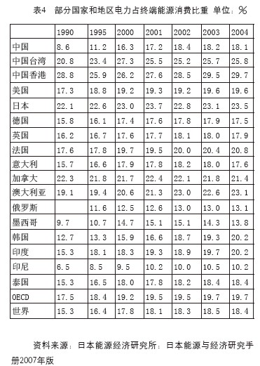 隨著我國(guó)經(jīng)濟(jì)社會(huì)的快速發(fā)展,終端能源消費(fèi)結(jié)構(gòu)正在向優(yōu)質(zhì)化發(fā)展。1990年到2005年間終端能源消費(fèi)結(jié)構(gòu)中煤炭的比重在下降,電力和石油的比重在上升,電力上升了9.4個(gè)百分點(diǎn),石油上升了8.7個(gè)百分點(diǎn),天然氣提高了0.8個(gè)百分點(diǎn),而煤炭終端消費(fèi)比重下降了20.3個(gè)百分點(diǎn)。1990年我國(guó)煤炭、石油、天然氣和電力終端消費(fèi)的比重為67.1:1 8. 0 :2 . 5 : 8 . 6 ,而20 05年這個(gè)比例是46 . 2 :26.7:3.3:18.0.從表4可以看到雖然中國(guó)自1990年以后電力在終端能源消費(fèi)的比重上升很快,超過了發(fā)達(dá)國(guó)家和若干發(fā)展中國(guó)家的上升速度,但是到目前為止也只達(dá)到世界及OECD的平均水平。雖然還有繼續(xù)上升的趨勢(shì),但在近期不可能達(dá)到以電為主的道路。所謂終端能源消費(fèi)走以電為主之路,那么電力在終端能源消費(fèi)中的比重至少要達(dá)到50%以上,我們從表4中可以看到,到2004年世界主要國(guó)家和地區(qū),最高水平是我國(guó)的香港,也只達(dá)到29.7%,美、德、英、意等國(guó)沒有超過20%,日、法、加、澳等國(guó)沒有超過25%。這些事實(shí)都說明:當(dāng)一次能源消費(fèi)還是不可能走以化石能源時(shí),從合理利用能源的角度出發(fā),能源消費(fèi)是不可鞥走以電為主的道路的。中國(guó)的一次能源中缺少油、氣等優(yōu)質(zhì)能源,需要多消耗一些電力,電力在終端能源消費(fèi)的比例可能比某些國(guó)家高一些是有可能的,也是合理的,但不可能高得很多,因?yàn)樵谀承╊I(lǐng)域用電力代替其他能源會(huì)造成能效損失。