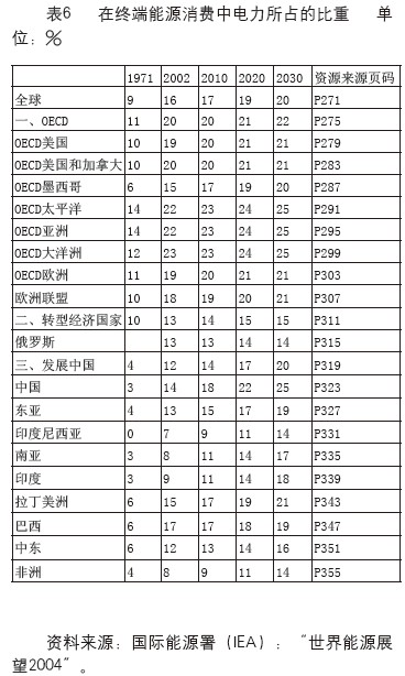 從全球分地區(qū)的終端能源消費(fèi)中2030年電力比重來看,經(jīng)濟(jì)合作與展望組織國(guó)家(OECD)即發(fā)達(dá)國(guó)家為22%,轉(zhuǎn)型經(jīng)濟(jì)國(guó)家為15%,發(fā)展中國(guó)家為20%。按國(guó)別分:美國(guó)和加拿大為21%,俄羅斯14%,中國(guó)25%,印度尼西亞14%,印度18%,巴西19%。中國(guó)是最高的,中國(guó)2030年在能源終端消費(fèi)中電力的比重為25%,如果扣除生物質(zhì)能源和廢料的影響,電力所占的比重為28.3%,與電力占終端能源消費(fèi)為主的差距也是很大的。具體數(shù)據(jù)見表6。
