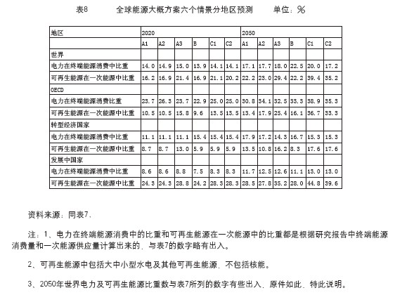 世界能源理事會(huì)等的能源預(yù)測(cè)中,還有過去的預(yù)測(cè),我們把2020年和2050年的分區(qū)預(yù)測(cè)的電力占終端能源消費(fèi)比重和可再生能源比重計(jì)算出來,例如表8。從表8中可以看到,發(fā)展中國(guó)家可再生能源的利用比例要比發(fā)達(dá)國(guó)家(OECD)和轉(zhuǎn)型經(jīng)濟(jì)國(guó)家要高得多,但是,電力在終端能源利用中的比例卻是發(fā)達(dá)國(guó)家最高,轉(zhuǎn)型經(jīng)濟(jì)國(guó)家居中,發(fā)展中國(guó)家最低。這個(gè)資料說明一個(gè)問題,當(dāng)能源利用進(jìn)入后化石時(shí)代,減少化石能源的利用比例,增加可再生能源資源的開發(fā)利用比例,電力在終端能源消費(fèi)中的比例不一定隨之上升,在可再生能源中,如生物質(zhì)能、太陽能等不一定要轉(zhuǎn)化成電力來使用,電力在終端能源消費(fèi)中的比例高低取決于經(jīng)濟(jì)發(fā)展水平。