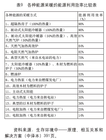 這里需要特別說明的是,不能把終端能源利用效率與通常所說的能源利用效率混為一談。對(duì)于電力利用要特別注意這個(gè)問題,因?yàn)殡娏Φ奶攸c(diǎn)是加工、轉(zhuǎn)換、儲(chǔ)運(yùn)等中間環(huán)節(jié)的損失很大,效率很低,而終端的利用效率很高,如果電阻加熱取暖器效率為90%,比其他任何能源加熱器都要高,如果用這個(gè)效率來評(píng)價(jià)電力,那么電力的效率很高,但是電力考慮中間環(huán)節(jié)效率之后,則真正的能源利用效率卻是極低的。從科學(xué)用能、合理用能來講,我們應(yīng)當(dāng)提倡熱電聯(lián)產(chǎn)(CHP),冷熱電聯(lián)產(chǎn)(CCHP)而不應(yīng)當(dāng)提倡電阻式電鍋爐,電阻式電暖氣、電淋浴器、電開水器等。下面用一張各種能源采暖的能源利用效率比較表來說明這個(gè)問題。