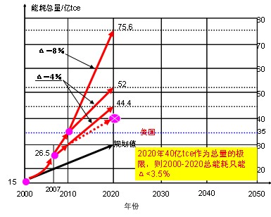 我國正處在工業(yè)化、城鎮(zhèn)化和機(jī)動化并舉時期,從經(jīng)濟(jì)發(fā)展階段的客觀規(guī)律來說,中國也會經(jīng)歷基礎(chǔ)設(shè)施建設(shè)的高能源強(qiáng)度時期,目前正處于上升階段。從圖1對我國能源消費(fèi)總量的估算可知,如果2008–2010年能源消費(fèi)總量年均增長率為4%,則到2010年能源消費(fèi)總量約為30億tce(實際上打不住,最近幾年增長是10%,年增長約2億tce);當(dāng)年均增長率為8%時,2010年能源消費(fèi)總量約35億tce。如果2011–2020年能源消費(fèi)總量按年均增長率4%和8%分別進(jìn)行估算,比較有可能的是2020年能源消費(fèi)總量達(dá)到52 億tce。這遠(yuǎn)遠(yuǎn)超過我國資源和環(huán)境生態(tài)所能承載的極限。美國2006年的能耗總量為33.3億tce,按照我國目前的勢頭,將在2010年就要超過美國成為世界第一耗能大國。然而,且不說溫室氣體排放所面臨的巨大壓力,從資源供應(yīng)、環(huán)境容量、生態(tài)退化、能源安全來說,這個能耗總量是我國這塊土地所無法承受的。