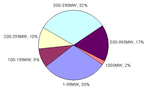 截至2007年底,我國總發(fā)電裝機(jī)容量為71329萬kW,其中火電55442萬kW。國內(nèi)最先進(jìn)的火力發(fā)電裝備已達(dá)到或接近世界先進(jìn)水平。由于目前我國的火電機(jī)組仍以中小型火電機(jī)組為主,單機(jī)容量100MW以下的機(jī)組容量比例占火電裝機(jī)總量的30%,而單機(jī)容量500MW以上的機(jī)組所占容量比例不到20%(圖3),由此導(dǎo)致我國總體發(fā)電水平低下。[2, 3]發(fā)電效率提高1%,可以實現(xiàn)CO2減排2%-3%。