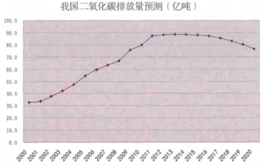 2009年我國(guó)提出到2020年單位國(guó)內(nèi)生產(chǎn)總值二氧化碳排放比2005年下降40%~45%的發(fā)展目標(biāo)。假定目標(biāo)能夠?qū)崿F(xiàn),結(jié)合我國(guó)今后一段時(shí)期GDP增長(zhǎng)率7%的假設(shè)(假設(shè)依據(jù)來(lái)自我國(guó)政府的宏觀經(jīng)濟(jì)發(fā)展目標(biāo)),測(cè)算今后一段時(shí)期我國(guó)二氧化碳排放數(shù)量,預(yù)測(cè)結(jié)果顯示(見(jiàn)下圖),2015年以前我國(guó)碳排放量將維持在一個(gè)固定的水平,排放規(guī)模大約在88億噸,2017年之后才有可能出現(xiàn)緩慢下降趨勢(shì)。