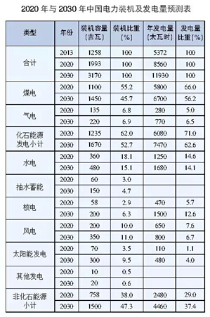 結(jié)合能源革命的要求,經(jīng)過綜合分析,作者提出2020年底及2030年底中國電力裝機(jī)結(jié)構(gòu)和發(fā)電量結(jié)構(gòu)的估計,見表。