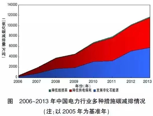 電廠二氧化碳捕集、利用、埋存的試點(diǎn)取得了成功經(jīng)驗。燃煤或燃?xì)怆姀S煙氣中的二氧化碳捕集能力為3000噸/年到12萬噸/年的幾個試點(diǎn)項目在運(yùn)行;二氧化碳埋存的地質(zhì)調(diào)查也做了大量工作;基于工程項目的燃煤電廠富氧燃燒捕集二氧化碳的國際合作研究有效開展。中國通過發(fā)展非化石能源、降低煤耗和線損率等措施,以2005年為基準(zhǔn)年,2006~2014年,累計減排二氧化碳約60億噸,2014年單位發(fā)電量二氧化碳排放量比2005年降低了19%。根據(jù)作者的相關(guān)研究,電力二氧化碳減排的貢獻(xiàn)見下圖。