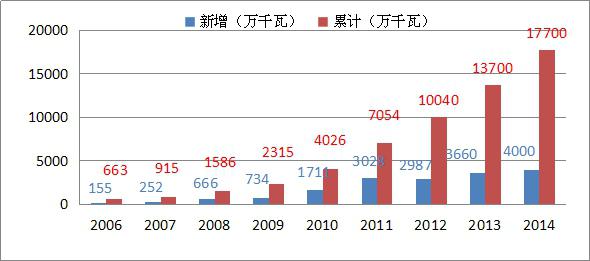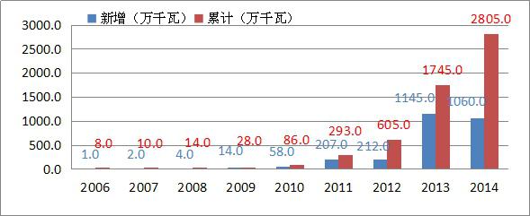 我國的光伏發(fā)電裝機(jī)容量2005年僅為7萬KW左右,相比歐美等西方發(fā)達(dá)國家,我國的光伏發(fā)電產(chǎn)業(yè)起步較晚,但發(fā)展很快,到2014年發(fā)電裝機(jī)已達(dá)到2805萬千瓦,與“十一五”末的2005年相比增長了400倍。