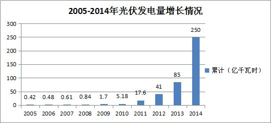 我國的光伏發(fā)電量2005年僅為0.42億KWH,到2014年已達(dá)到250億KWH,比2005年增長了近595倍,雖然基數(shù)非常小,但是增長速度非???。