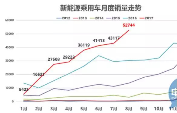 據(jù)乘聯(lián)會(huì)的數(shù)據(jù),2017年8月新能源乘用車銷量創(chuàng)有史以來單月銷量新高,達(dá)到52744臺,環(huán)比7月增長1萬臺,同比增速72%。