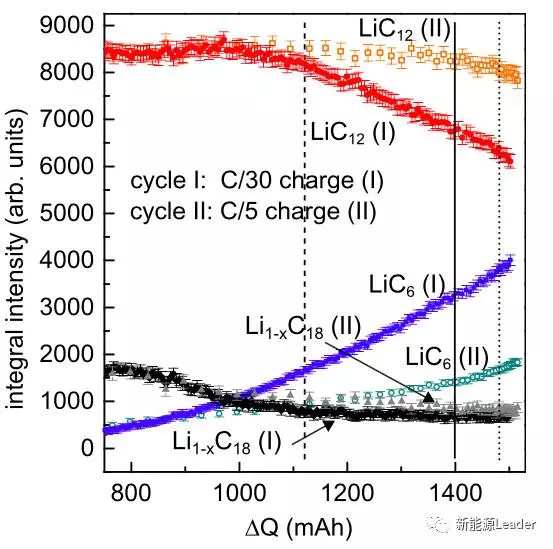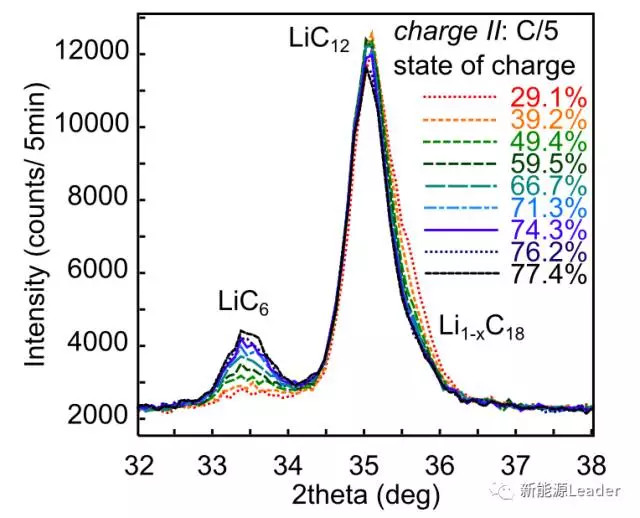 下圖為在-20℃低溫下,按照C/5倍率充電的過程中,負極石墨的物相變化,可以看到,相比于C/30倍率充電,石墨的物相變化有著明顯的不同,從圖上可以看到,在SoC>40%時,C/5充電倍率下電池LiC12物相的強度降低要明顯較慢,LiC6物相強度升高也要明顯弱于C/30倍率充電,這表明在C/5相對較高的倍率下,更少的LiC12持續(xù)嵌鋰,轉(zhuǎn)換為LiC6。