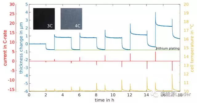 實(shí)驗(yàn)中采用的電池為能量型的20Ah方形NMC/石墨鋰離子電池,實(shí)驗(yàn)在控溫箱中進(jìn)行,實(shí)驗(yàn)溫度分別控制在0,10和25℃,這都是電動汽車常見的使用溫度,實(shí)驗(yàn)的電池的SoC分別為12.5%、50%和75%,基本上覆蓋了動力電池的使用范圍。下圖為SoC為12.5%,溫度10℃,充電量為1.25%時電池在不同的充放電倍率下,電池厚度變化的信息。從圖上可以看到,在小電流時,在鋰離子電池完成放電時,電池的厚度還能夠回到初始值,但是當(dāng)充電電流達(dá)到4C以上時,電池的厚度就無法恢復(fù)到初始厚度,而這部分增加的厚度就是因?yàn)榻饘黉囋谪?fù)極表面析出造成的,并且電流越大,析出的金屬鋰越多,鋰離子電池厚度增加的也就越多。所以此時,保證電池不析出金屬鋰的電流就在3C-4C之間。