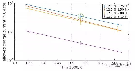 下圖為SoC為12.5%的電池,不同的充電量下(1.25%、2.5%、5%和87.5%),最大電流與環(huán)境溫度的關(guān)系,從圖上可以看到,充電量越多,則最大充電電流越小,溫度越低,充電電流越小。同時我們注意到,雖然四條曲線雖然電流差異很大,但是幾條曲線的斜率基本上是一致的。