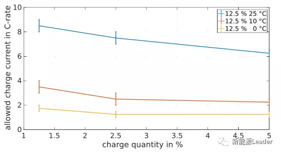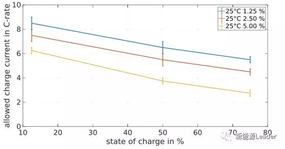 下圖為25℃,不同的充電電量下(1.25%、2.5%和5%),最大充電電流與電池SoC之間的關(guān)系,從圖上可以看到,隨著電池SoC狀態(tài)的增加,鋰離子電池的最大充電電流也在降低。