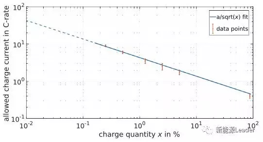 下圖為SoC為12.5%的電池,在溫度為10℃的條件下,最大充電電流與充電電量之間的關(guān)系,可以看到,此時充電電量與最大充電電流之間幾乎是呈現(xiàn)線性相關(guān)的關(guān)系的,關(guān)系式如下所示,其中a=4.3。這意味著小充電電量,可以采用更大的充電電流,例如當(dāng)充電電量為0.1%時,對于SoC為12.5%,溫度為10℃的電池,最大充電電流可達(dá)13.7C。