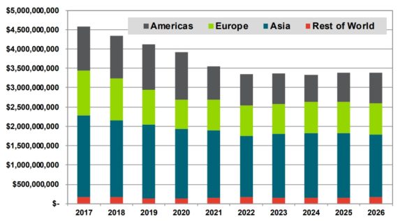 2017年,風(fēng)機(jī)材料市場的估計(jì)值為45.7億美元。其中,亞洲市場代表著風(fēng)機(jī)葉片材料的最大區(qū)域需求,預(yù)計(jì)2017年的市場規(guī)模為21.2億美元,其次是歐洲11.6億美元,緊隨其后的是美洲11.3億美元。考慮到全球風(fēng)能市場的規(guī)模大且日趨成熟的性質(zhì),在未來十年風(fēng)機(jī)葉片材料的增長率并不是太大,在大多數(shù)市場上已經(jīng)達(dá)到頂峰并趨于平穩(wěn)。