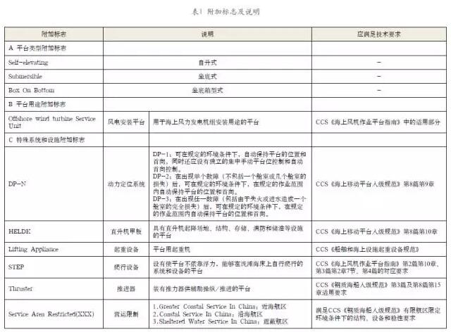 (2)附加標(biāo)志是指描述平臺(tái)類型、用途、特殊特征、航區(qū)限制以及其他含義的1個(gè)或1組標(biāo)志。附加標(biāo)志中除表示平臺(tái)類型和用途的符號(hào)外,其他附加標(biāo)志均為業(yè)主根據(jù)需求自愿進(jìn)行申請(qǐng),并經(jīng)中國(guó)船級(jí)社檢驗(yàn)確認(rèn)后授予。相關(guān)的附加標(biāo)志及說(shuō)明見(jiàn)下表所示。
