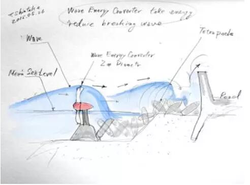 而日本的波浪能量轉(zhuǎn)換系統(tǒng)(Wave Energy Converter,WEC)則和防波堤用四腳錐體塊并肩作戰(zhàn),這些渦輪機(jī)放置在第一火線上,比如四腳錐體塊的前方或是珊瑚礁地形。由于從深海涌上淺海珊瑚礁的波浪會因“斷裂”產(chǎn)生極快速水流,渦輪機(jī)便在收集海浪能量的同時(shí)抵消浪潮直接沖擊岸邊的力道,減少日本沿岸受到的影響。