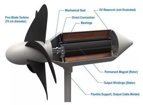 渦輪機(jī)本身設(shè)計(jì)成能承受極端海浪和惡劣天氣(比如臺風(fēng)),就像一朵花,直徑為70公分的5條旋轉(zhuǎn)葉片由柔軟材料制成,旋轉(zhuǎn)速度慢到足夠讓不小心被葉片掃過的海洋生物逃脫不受傷,支架結(jié)構(gòu)也靈活彎曲,以避免它們在大浪之下“剛極必折”。研究團(tuán)隊(duì)估計(jì),渦輪機(jī)的使用壽命長達(dá)10年。