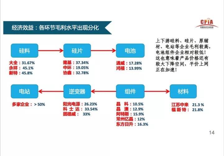 50GW的新增光伏裝機(jī)容量,今年光伏全產(chǎn)業(yè)鏈都趕上了好年景,中國光伏行業(yè)協(xié)會(huì)秘書長王勃華在發(fā)言時(shí)展示了一張圖片,可以更加直觀地看到光伏制造業(yè)今年的日子是很好過的,尤其是硅片、硅片上游環(huán)節(jié),逆變器企業(yè)的毛利率水平也令人羨慕。