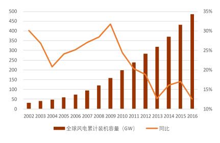 全球風(fēng)電新增裝機(jī)容量,2002-2009 年經(jīng)歷了高速發(fā)展期,年均復(fù)合增速達(dá)到 27%,2010-2016 年,波動(dòng)較大,整體發(fā)展進(jìn)入平穩(wěn)期,年均復(fù)合增速為 5%,但增量的絕對(duì)值較大。