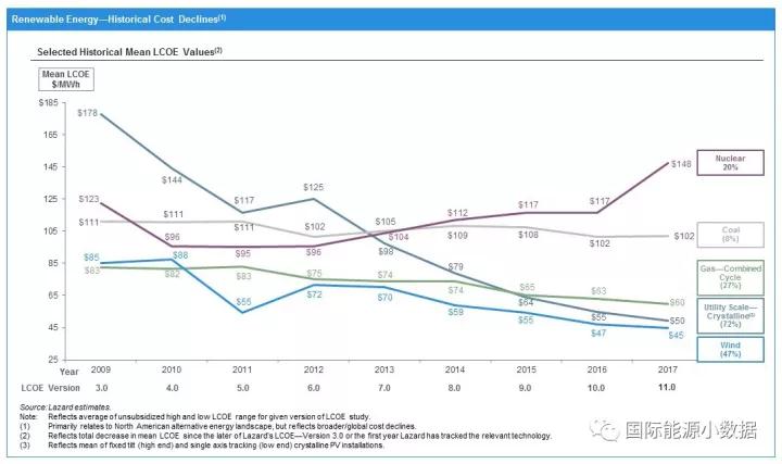 美國LAZARD公司日前發(fā)布一年一度的美國各類發(fā)電技術(shù)平準(zhǔn)成本(Lazard Levelized Cost of Energy Version 11.0)數(shù)據(jù)。