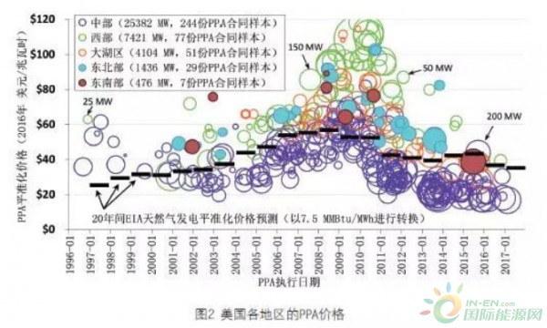但是要注意的是,購(gòu)電協(xié)議的風(fēng)電價(jià)格是統(tǒng)包價(jià)格(all-in price),其中包含了美國(guó)風(fēng)能生產(chǎn)稅抵免(Wind Production Tax Credit)之類(lèi)的補(bǔ)貼,該項(xiàng)抵免政策給予運(yùn)營(yíng)商18 美元/ 兆瓦時(shí)—23 美元/ 兆瓦時(shí)的稅收補(bǔ)貼。若排除生產(chǎn)稅抵免,美國(guó)中部地區(qū)的度電成本(LCOE)不到50 美元/ 兆瓦時(shí)(5 美分/ 千瓦時(shí))。