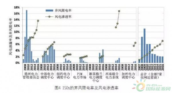 圖4 的數(shù)據(jù)顯示了2008 年至2016 年間美國(guó)7 家獨(dú)立電網(wǎng)運(yùn)營(yíng)商(ISOs)的風(fēng)電滲透率和棄風(fēng)限電率情況。