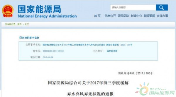 圖1. 11月14日,國家能源局發(fā)布《關(guān)于2017年前三季度緩解棄水棄風(fēng)棄光狀況的通報》