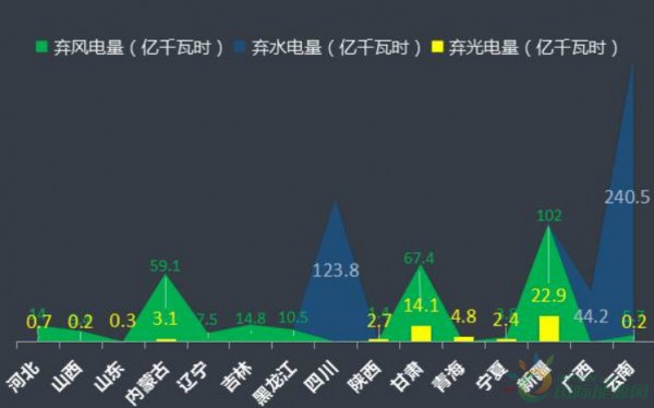 各省區(qū)棄風(fēng)、棄水、棄光電量如下圖所示: