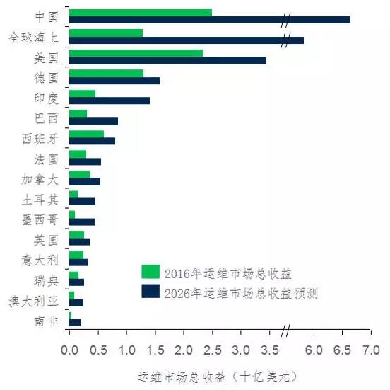 從下圖1可見(jiàn),歐洲運(yùn)維市場(chǎng)仍為2016年市場(chǎng)價(jià)值最為集中的區(qū)域,風(fēng)機(jī)吊裝歷史悠久、運(yùn)維成本也相對(duì)較高。從下圖2可見(jiàn),中國(guó)市場(chǎng)大量的吊裝項(xiàng)目將促使中國(guó)登頂2026年運(yùn)維市場(chǎng)收益之最,約美元67億。未來(lái)十年,美國(guó)、德國(guó)、印度、巴西與西班牙市場(chǎng)也將憑借大量的吊裝風(fēng)機(jī)體量成為全球最具運(yùn)維市場(chǎng)機(jī)遇與價(jià)值的區(qū)域。